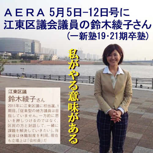 現在発売中の『AERA』(朝日新聞出版)5月5日-12日合併増大号の『大特集 キャリア再考 女性』のコーナーに、一新塾第19期・21期卒塾生で、江東区議会議員の鈴木綾子さんがご紹介されています。